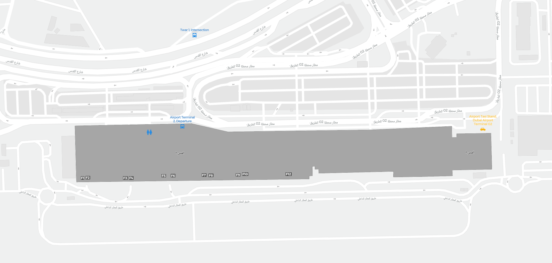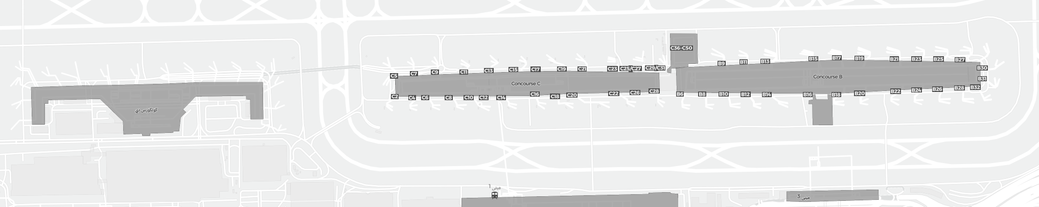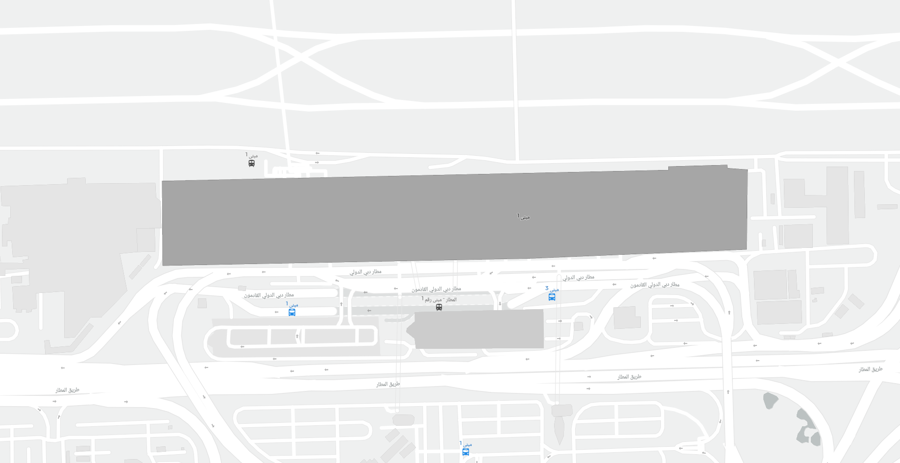 Dit is een inzoombare kaart van Dubai (DXB). De kaart geeft je een overzicht van het buitenterrein met terminals, parkeerplaatsen, en op sommige luchthavens ook details over gates, autoverhuur en andere voorzieningen bij inzoomen.