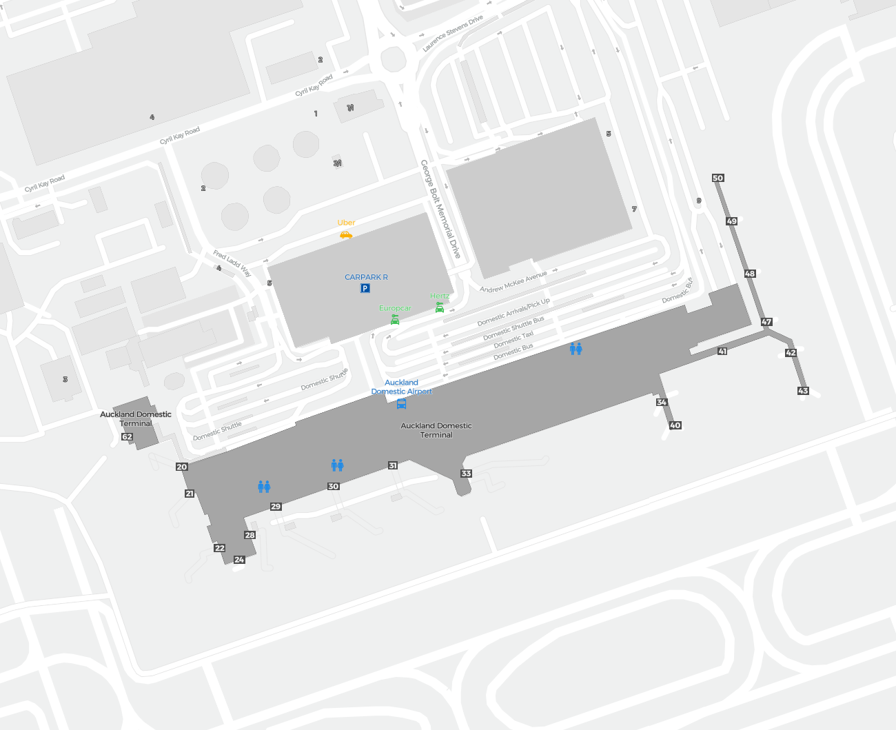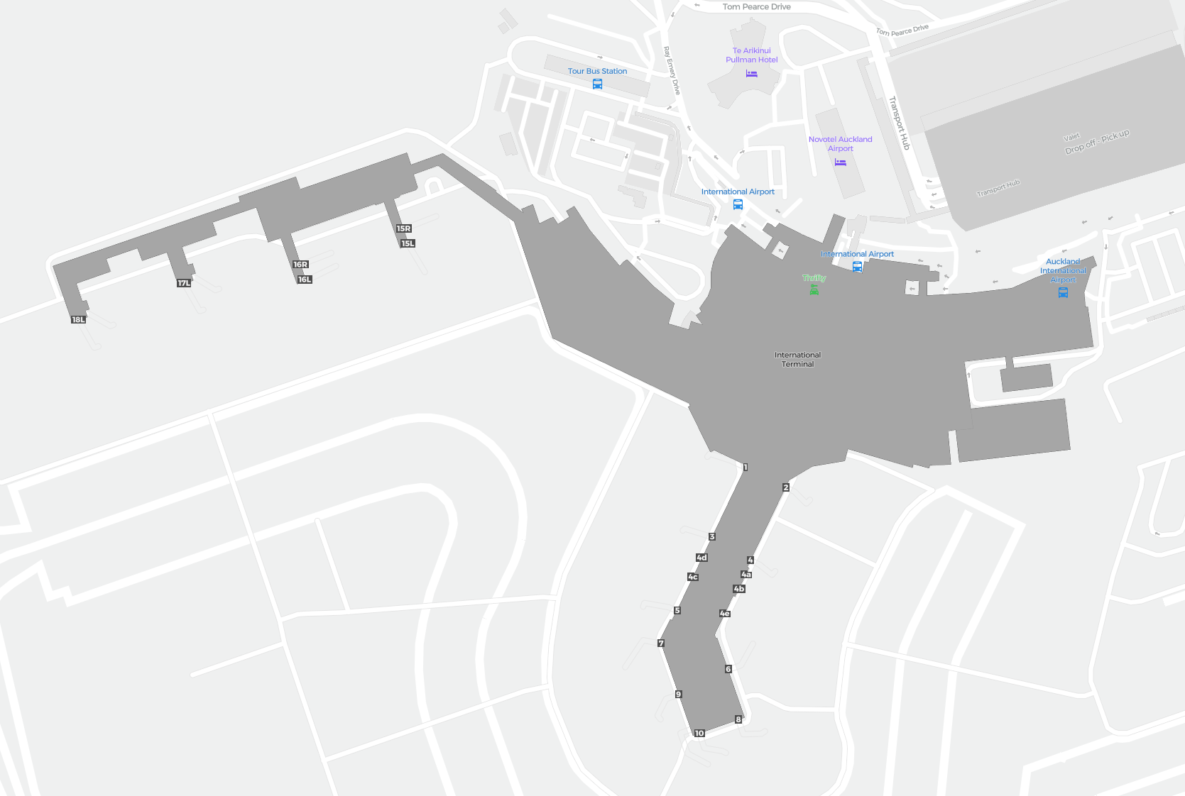 Dit is een inzoombare kaart van Auckland (AKL). De kaart geeft je een overzicht van het buitenterrein met terminals, parkeerplaatsen, en op sommige luchthavens ook details over gates, autoverhuur en andere voorzieningen bij inzoomen.