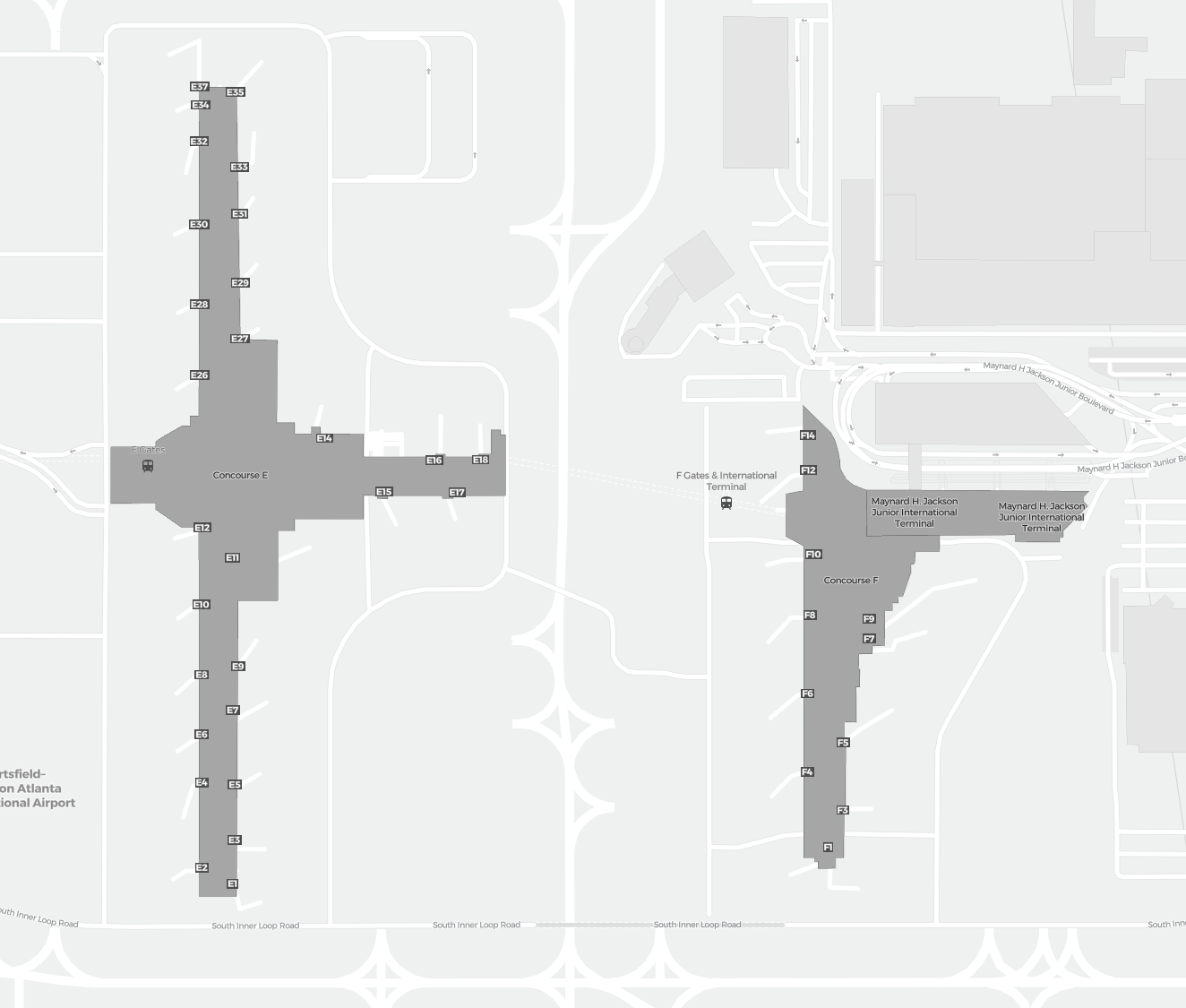 Dit is een inzoombare kaart van Atlanta (ATL). De kaart geeft je een overzicht van het buitenterrein met terminals, parkeerplaatsen, en op sommige luchthavens ook details over gates, autoverhuur en andere voorzieningen bij inzoomen.
