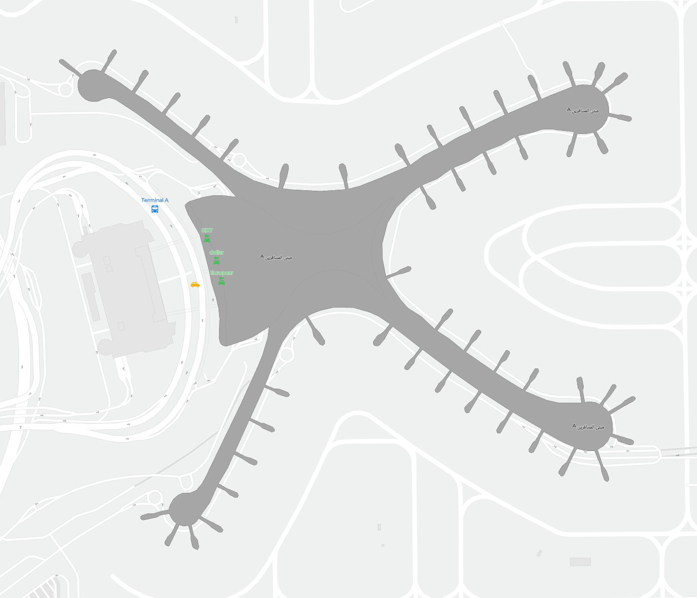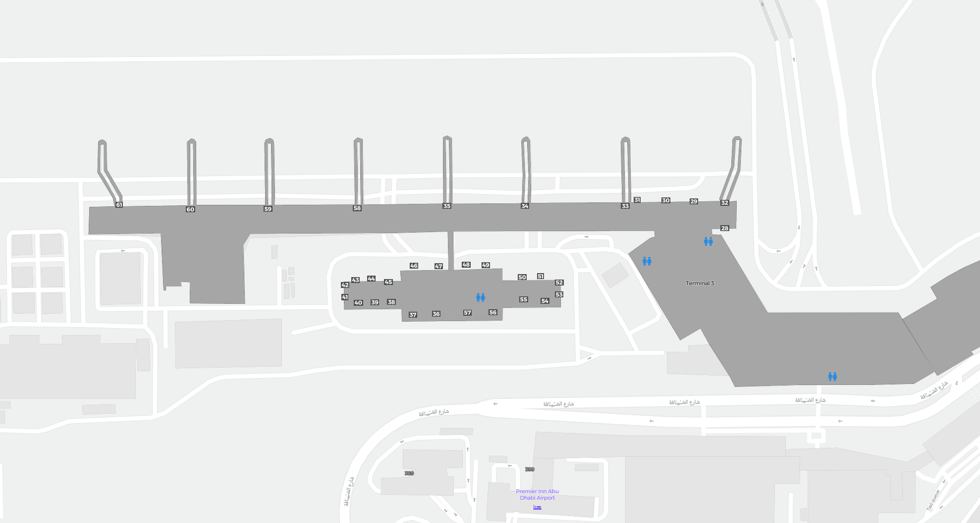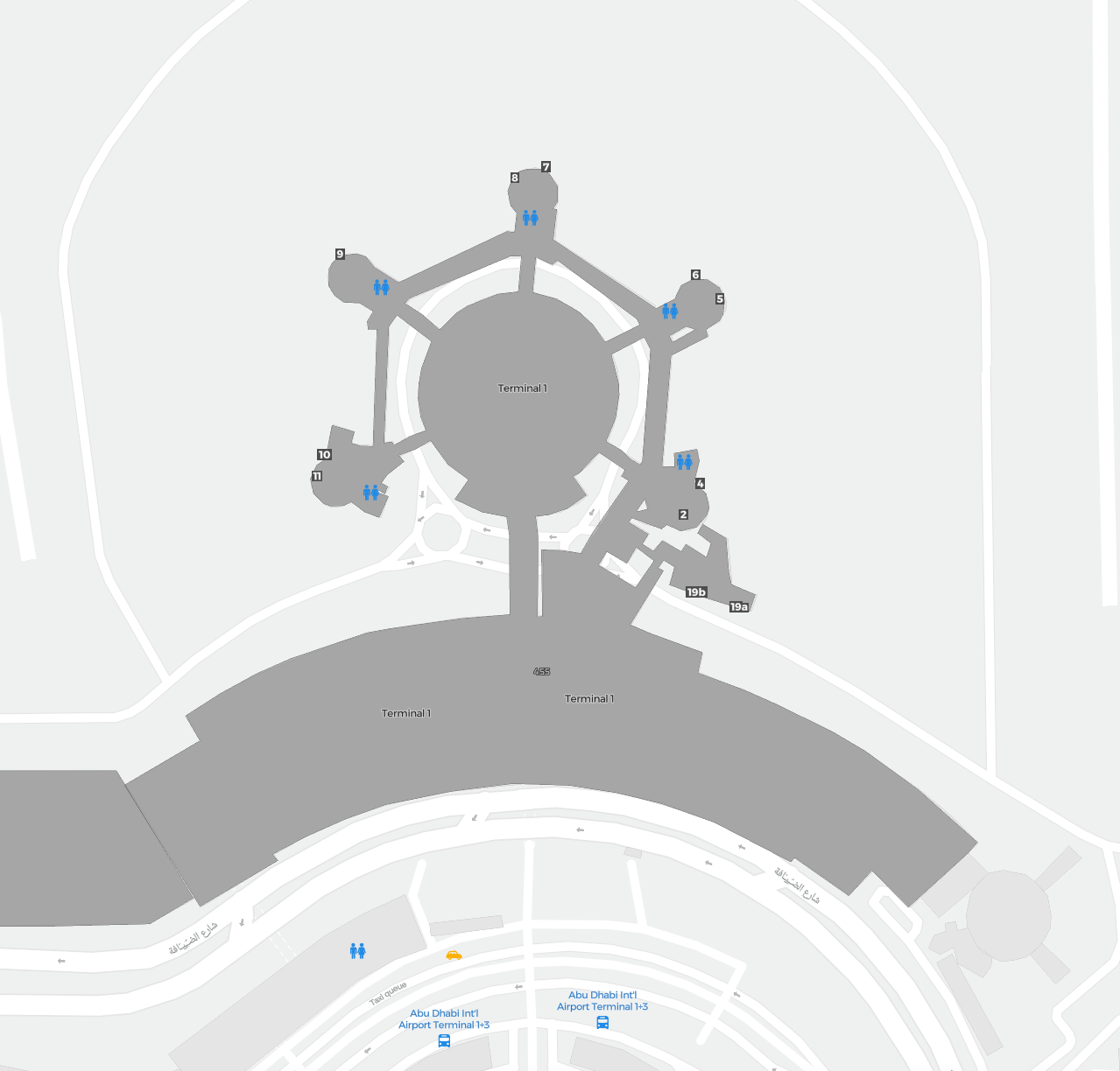 Dit is een inzoombare kaart van Abu Dhabi (AUH). De kaart geeft je een overzicht van het buitenterrein met terminals, parkeerplaatsen, en op sommige luchthavens ook details over gates, autoverhuur en andere voorzieningen bij inzoomen.