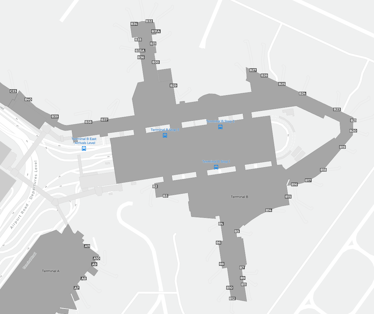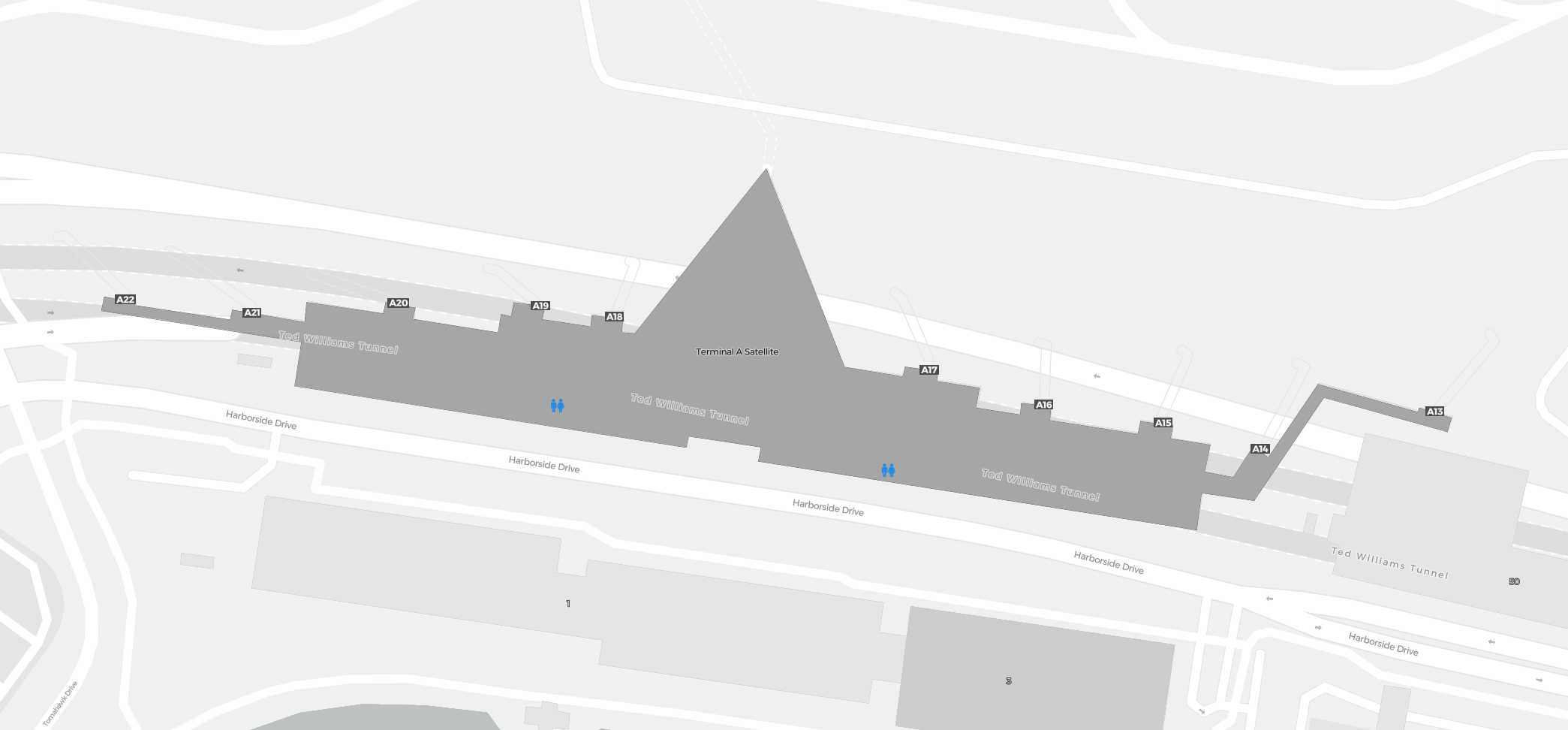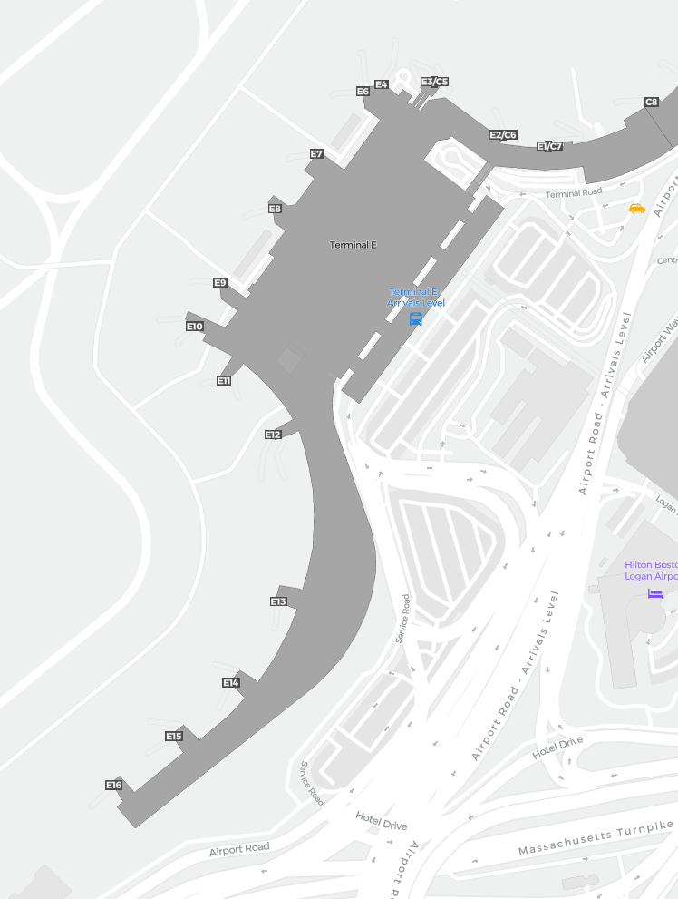 Dit is een inzoombare kaart van Boston (BOS). De kaart geeft je een overzicht van het buitenterrein met terminals, parkeerplaatsen, en op sommige luchthavens ook details over gates, autoverhuur en andere voorzieningen bij inzoomen.