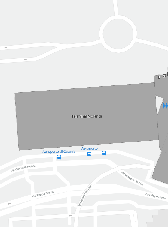 Dit is een inzoombare kaart van Catania (CTA). De kaart geeft je een overzicht van het buitenterrein met terminals, parkeerplaatsen, en op sommige luchthavens ook details over gates, autoverhuur en andere voorzieningen bij inzoomen.
