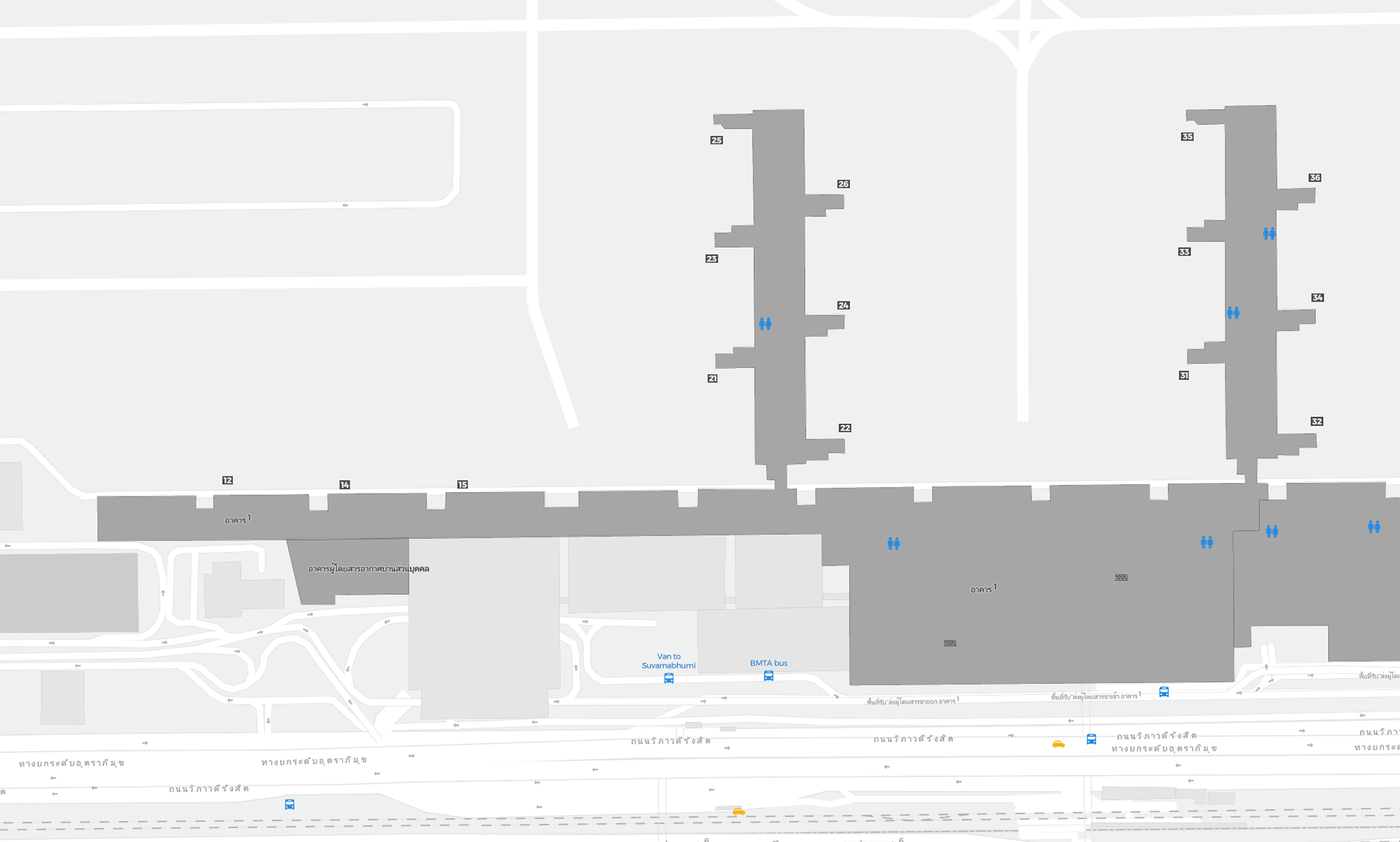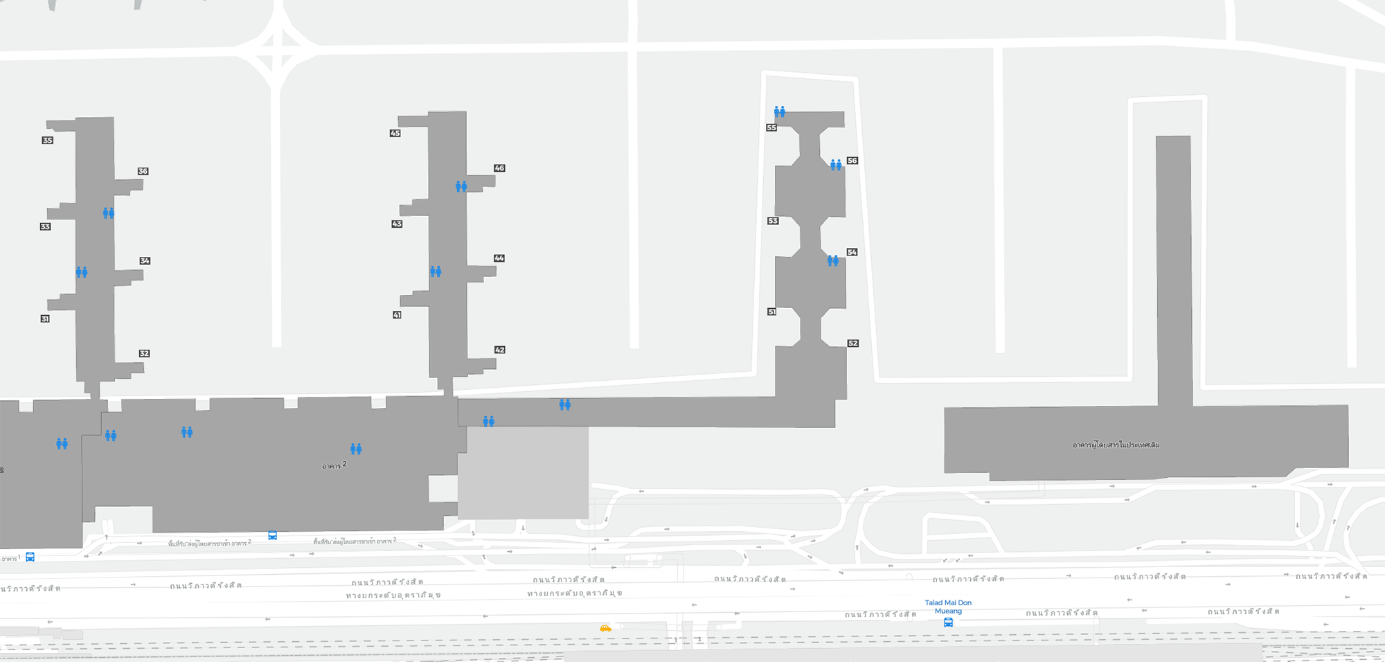 Dit is een inzoombare kaart van Bangkok (DMK). De kaart geeft je een overzicht van het buitenterrein met terminals, parkeerplaatsen, en op sommige luchthavens ook details over gates, autoverhuur en andere voorzieningen bij inzoomen.