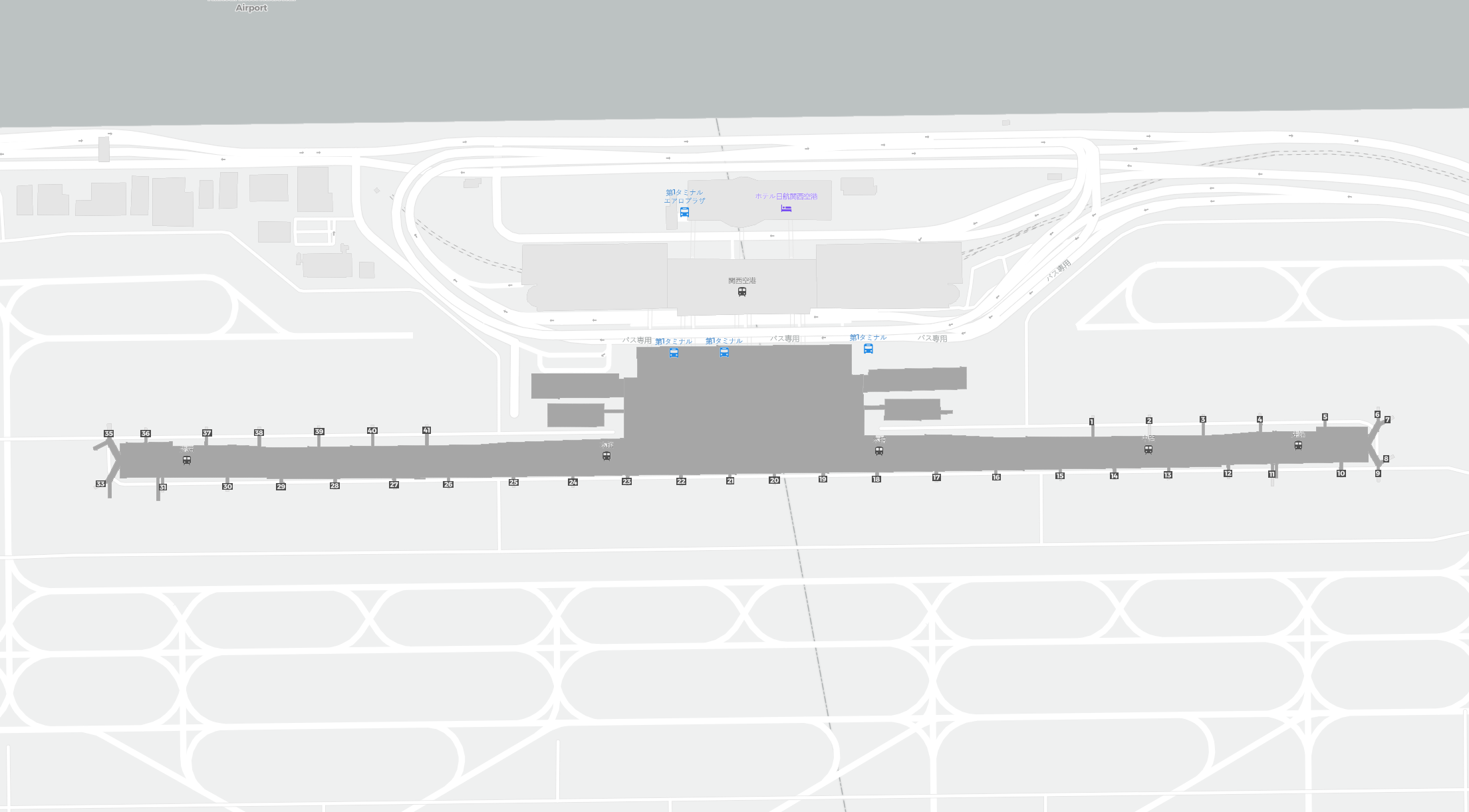 Dit is een inzoombare kaart van Osaka (KIX). De kaart geeft je een overzicht van het buitenterrein met terminals, parkeerplaatsen, en op sommige luchthavens ook details over gates, autoverhuur en andere voorzieningen bij inzoomen.