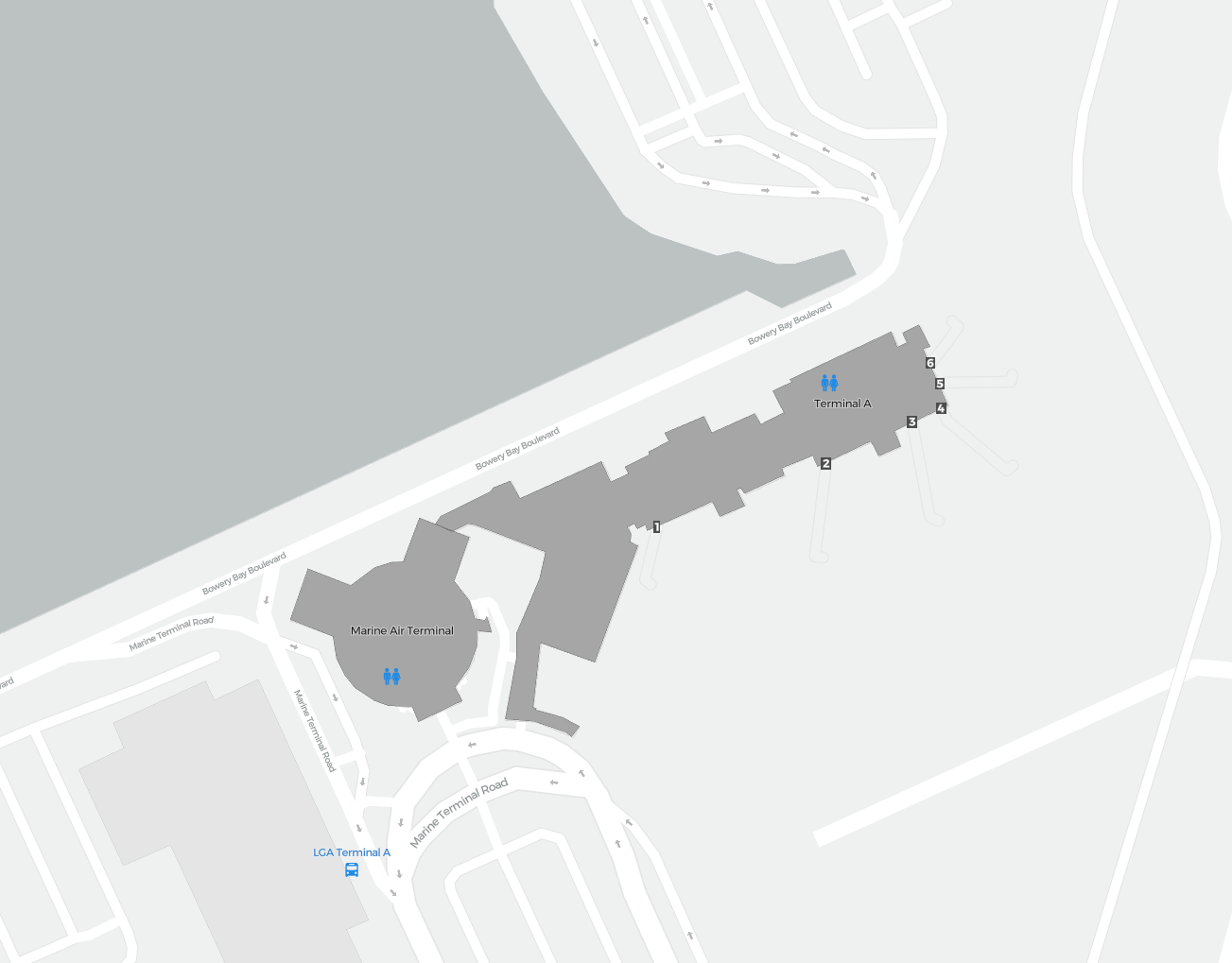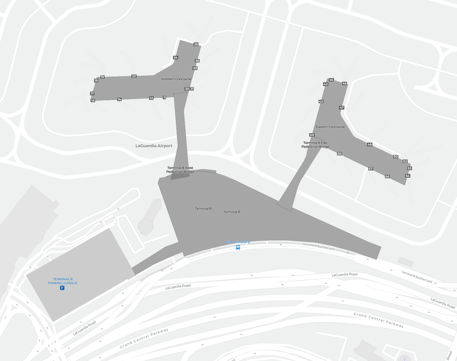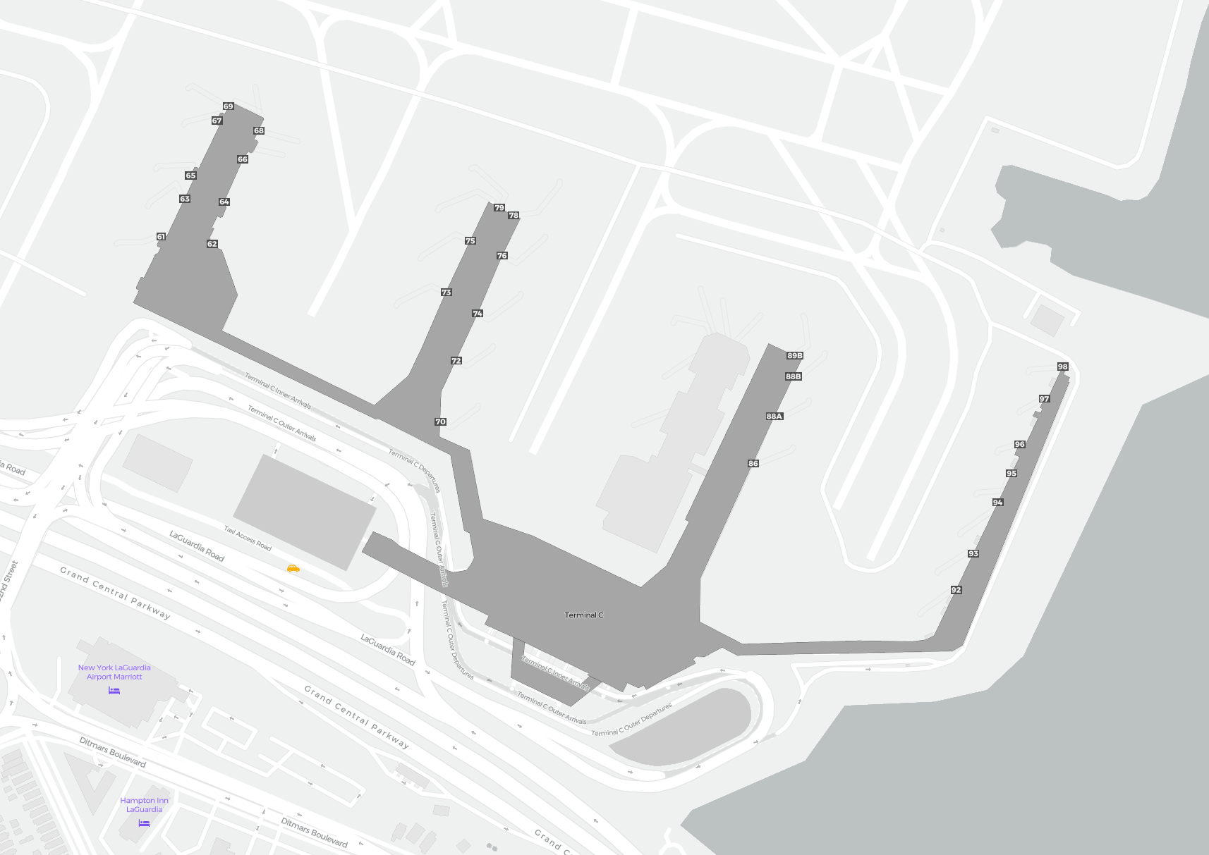 Dit is een inzoombare kaart van New York (LGA). De kaart geeft je een overzicht van het buitenterrein met terminals, parkeerplaatsen, en op sommige luchthavens ook details over gates, autoverhuur en andere voorzieningen bij inzoomen.