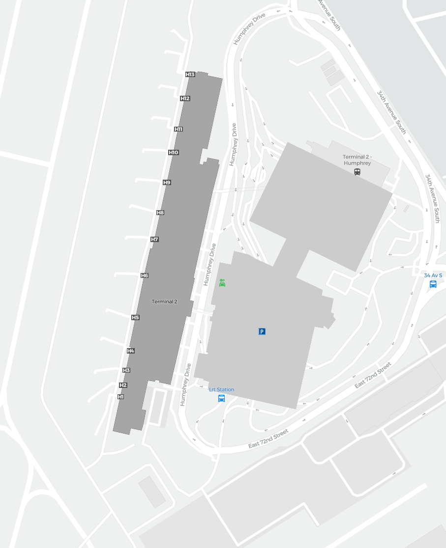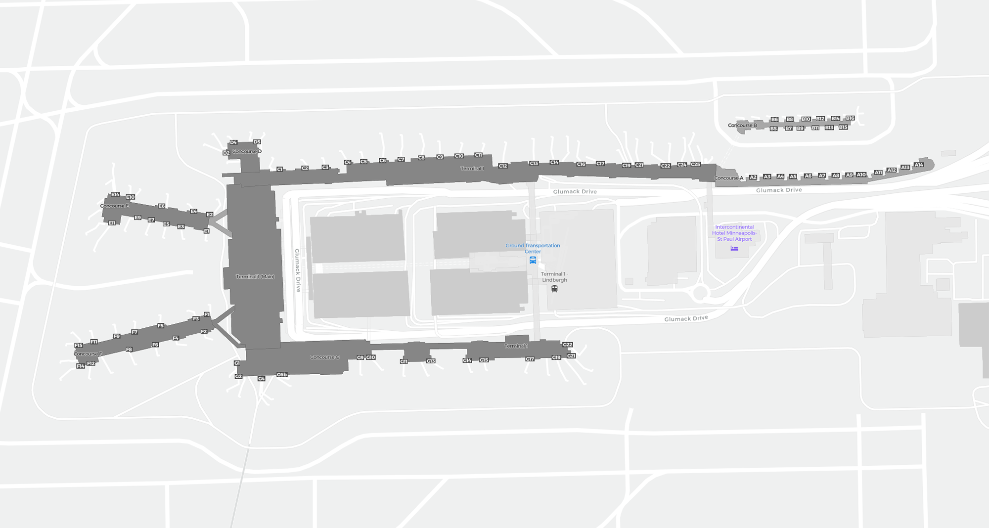 Dit is een inzoombare kaart van Minneapolis (MSP). De kaart geeft je een overzicht van het buitenterrein met terminals, parkeerplaatsen, en op sommige luchthavens ook details over gates, autoverhuur en andere voorzieningen bij inzoomen.