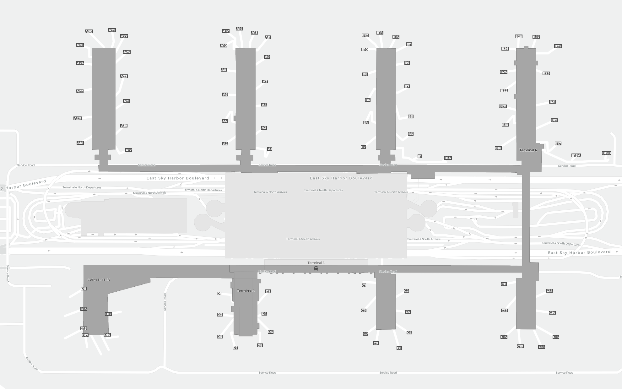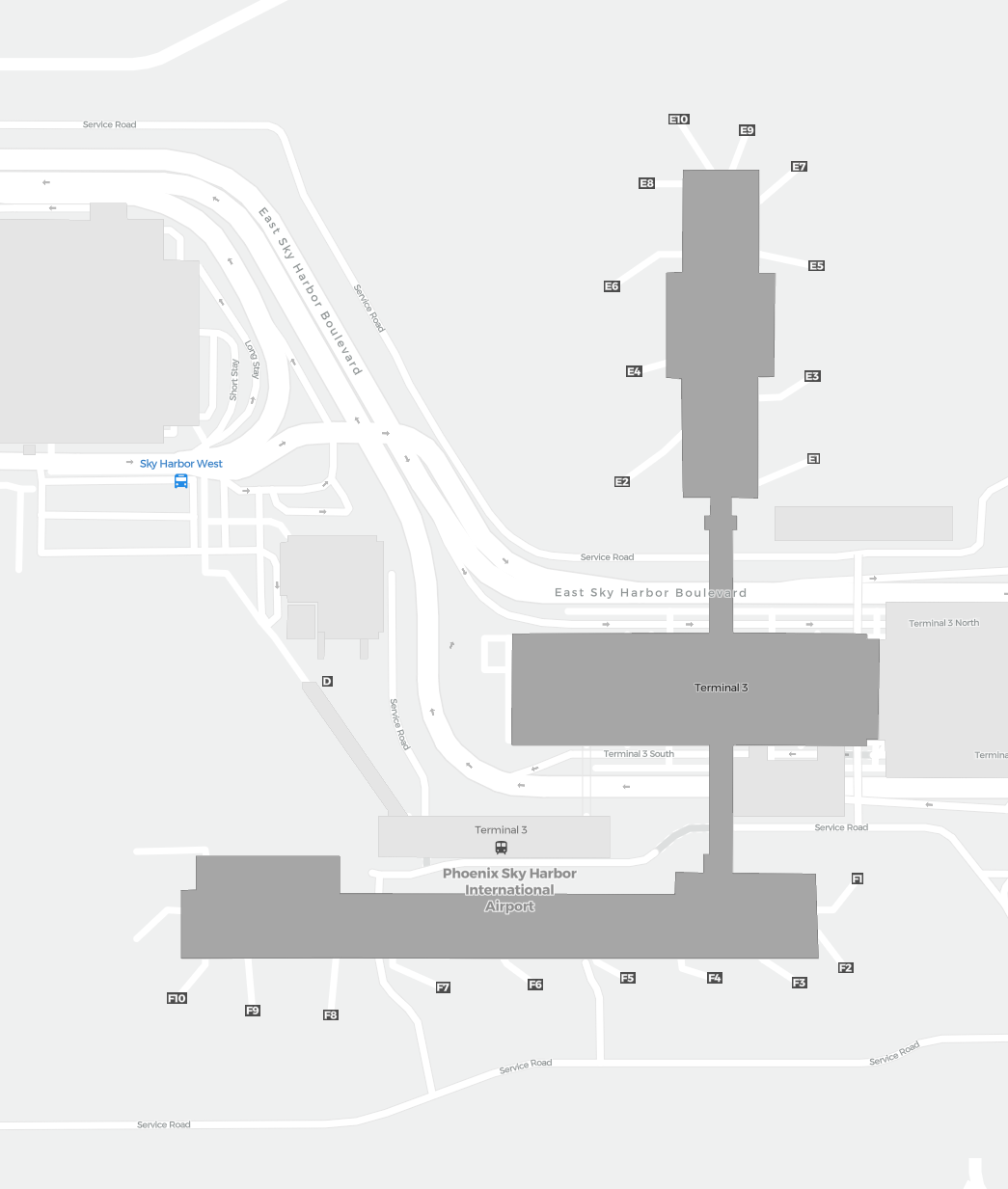 Dit is een inzoombare kaart van Phoenix (PHX). De kaart geeft je een overzicht van het buitenterrein met terminals, parkeerplaatsen, en op sommige luchthavens ook details over gates, autoverhuur en andere voorzieningen bij inzoomen.
