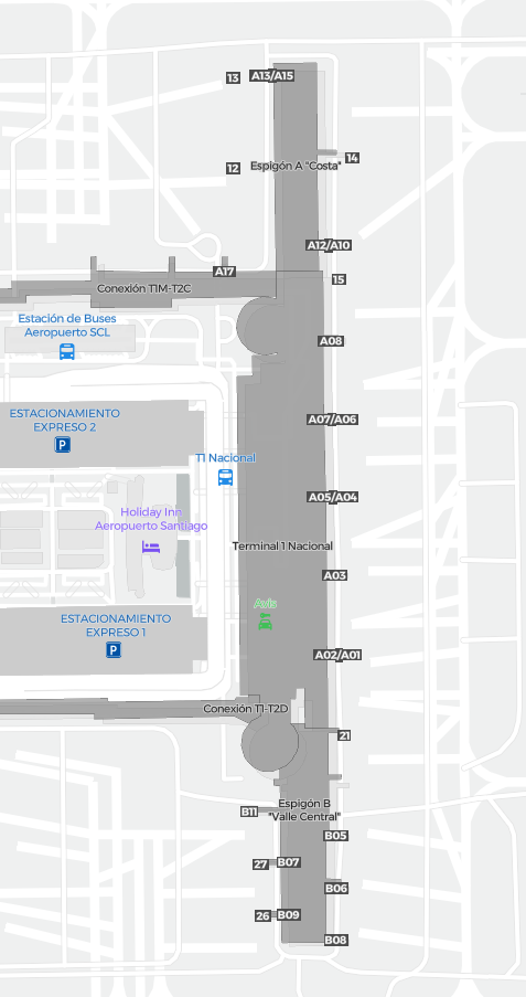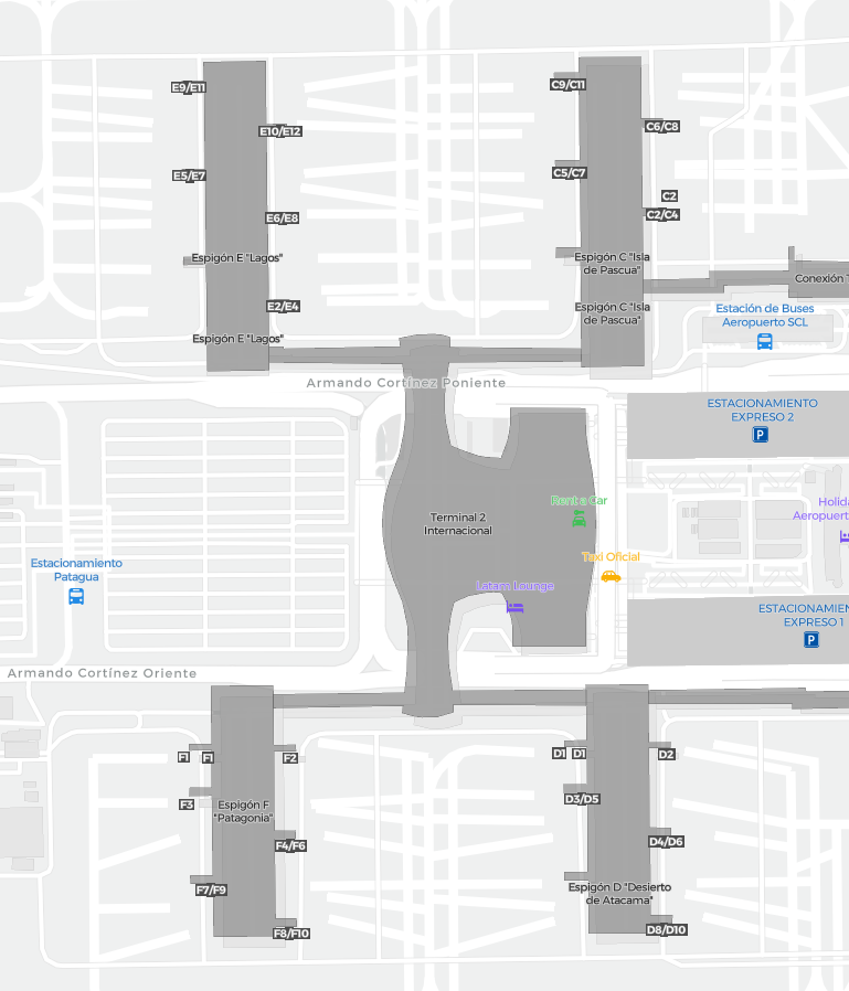 Dit is een inzoombare kaart van Santiago de Chile (SCL). De kaart geeft je een overzicht van het buitenterrein met terminals, parkeerplaatsen, en op sommige luchthavens ook details over gates, autoverhuur en andere voorzieningen bij inzoomen.