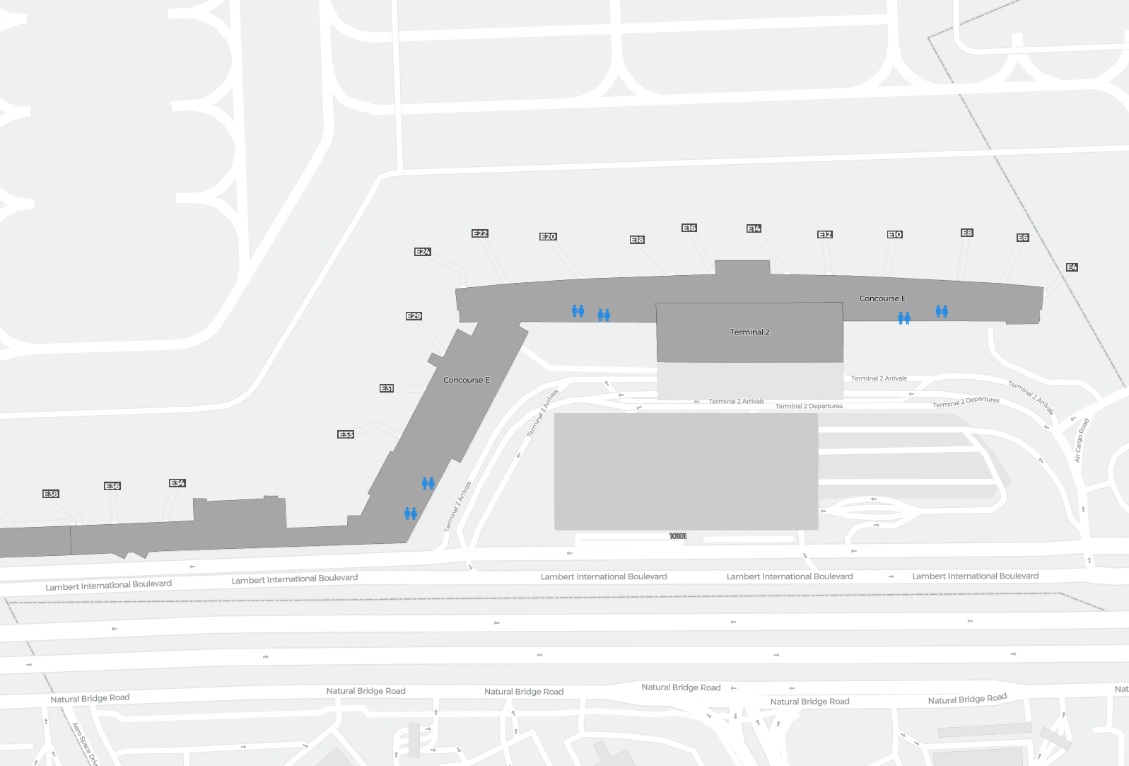 Dit is een inzoombare kaart van Saint Louis (STL). De kaart geeft je een overzicht van het buitenterrein met terminals, parkeerplaatsen, en op sommige luchthavens ook details over gates, autoverhuur en andere voorzieningen bij inzoomen.