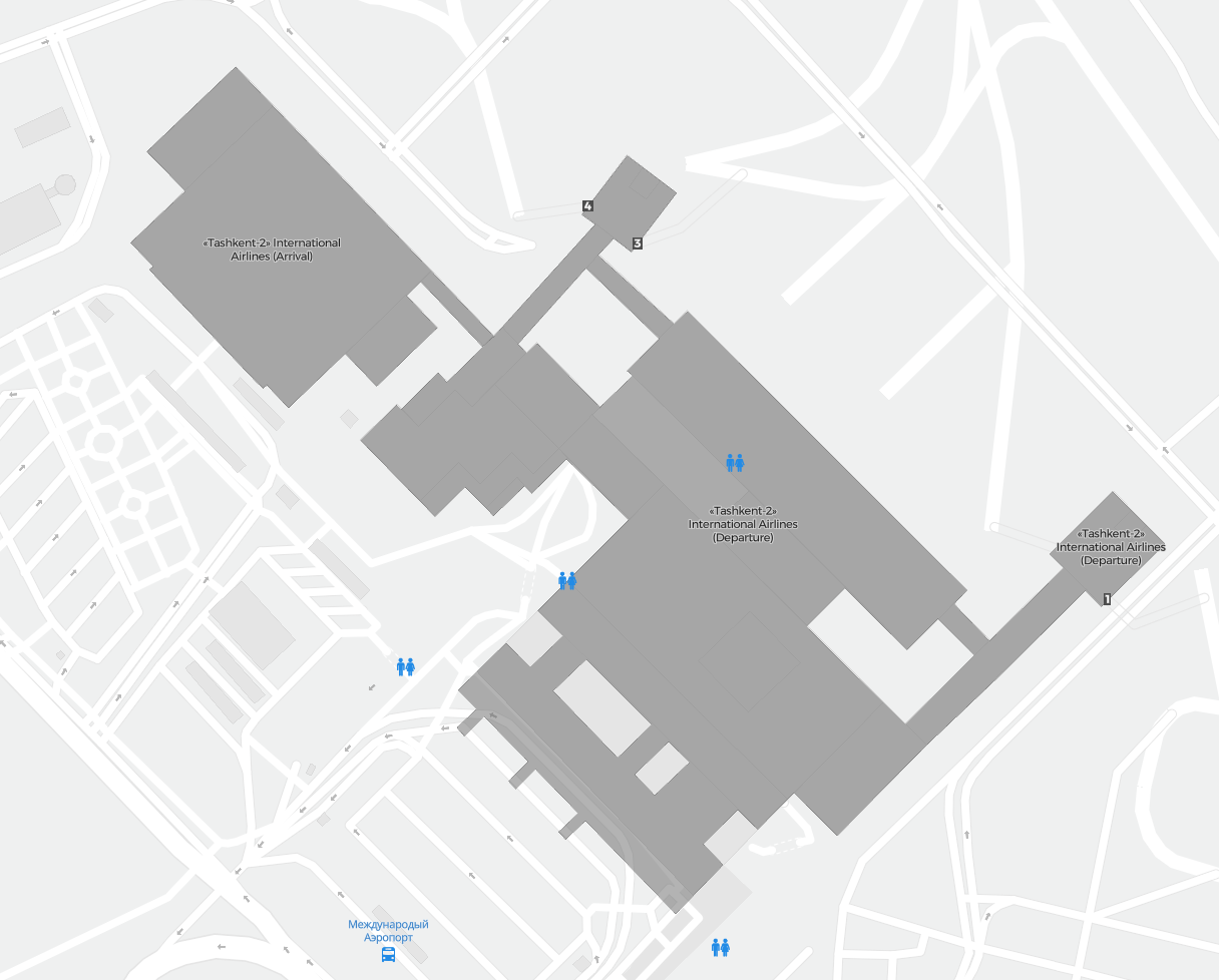 Dit is een inzoombare kaart van Tasjkent (TAS). De kaart geeft je een overzicht van het buitenterrein met terminals, parkeerplaatsen, en op sommige luchthavens ook details over gates, autoverhuur en andere voorzieningen bij inzoomen.