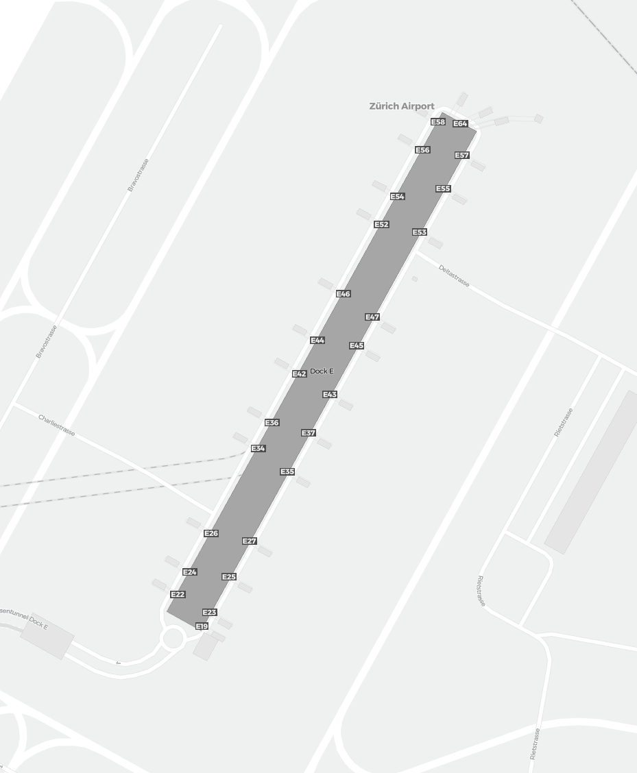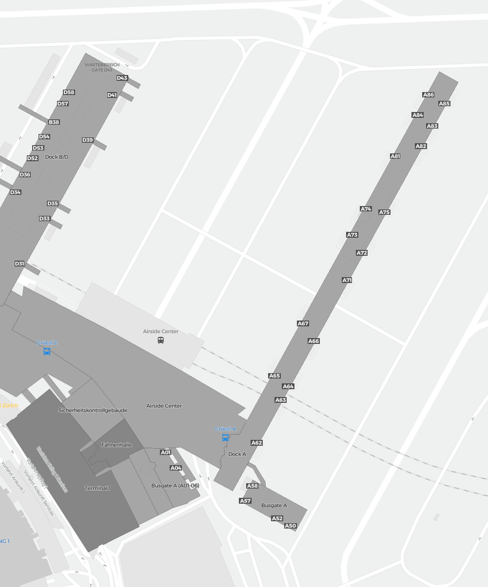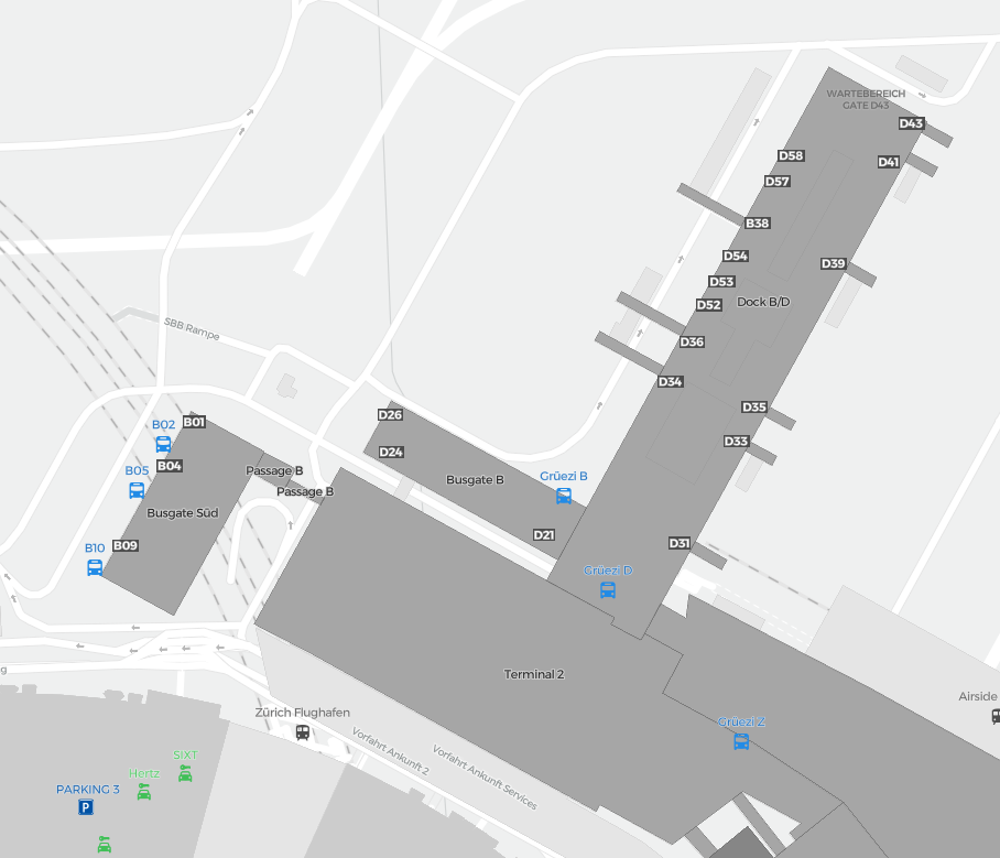 Dit is een inzoombare kaart van Zürich (ZRH). De kaart geeft je een overzicht van het buitenterrein met terminals, parkeerplaatsen, en op sommige luchthavens ook details over gates, autoverhuur en andere voorzieningen bij inzoomen.